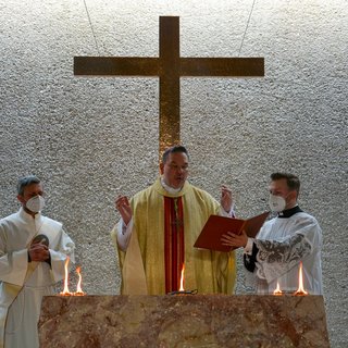 Nach dem Reinigen wurde der Altar für die Eucharistiefeier gedeckt. Althochmeister P. Prior Arnold Wieland und Dekan Hans Pamer konzelebrierten. Beim musikalisch gestalteten Pontifikalamt mit dabei waren Zeremoniar Florian Weber (persönlicher Sekretär des Hochmeisters), Pater Christof und Diakon Thomas Schwarz.